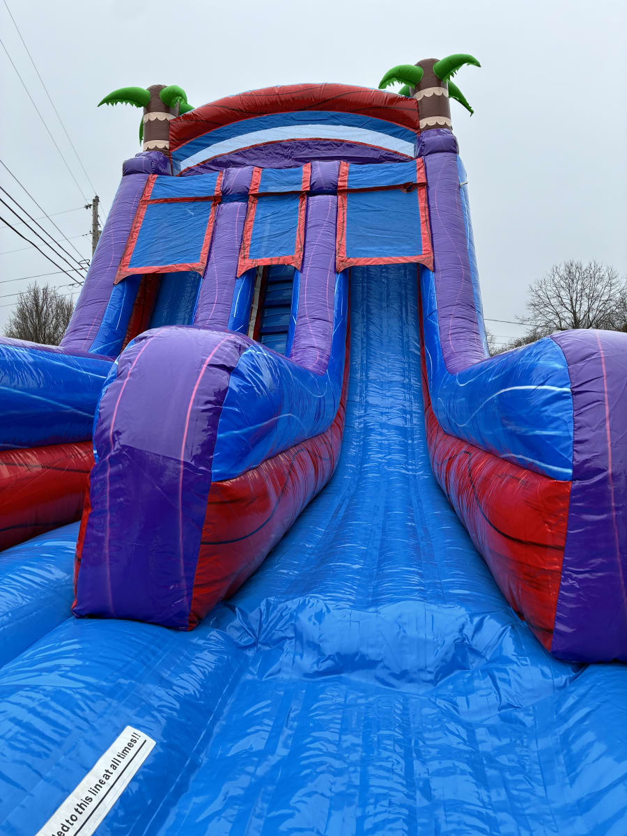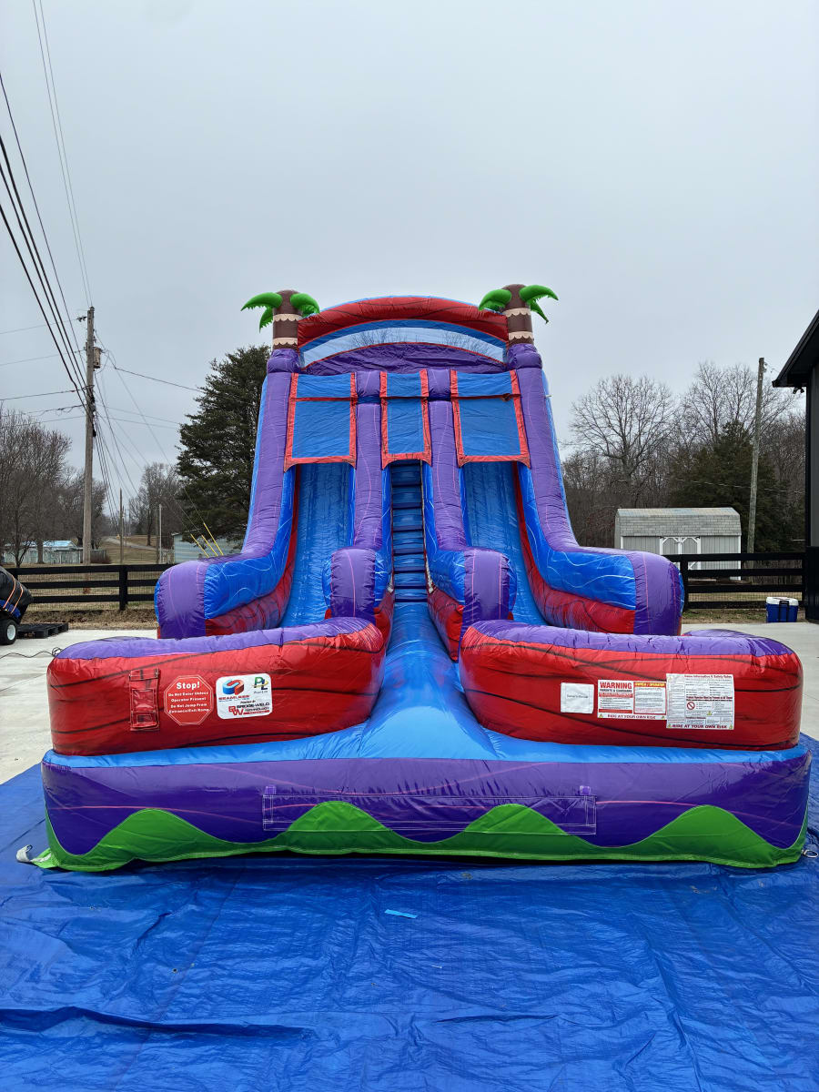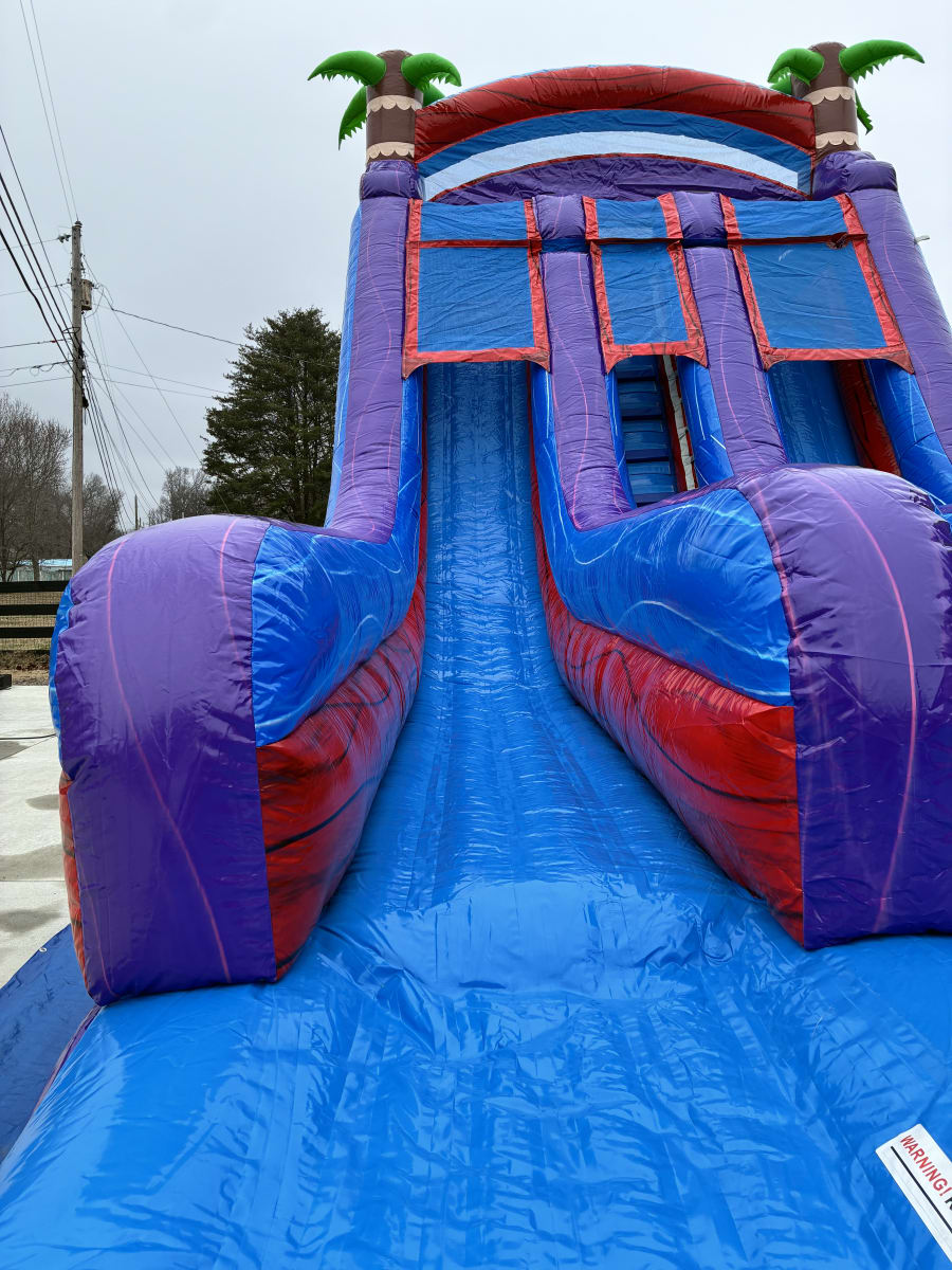 Make your next event unforgettable with the 18’ Racer’s Reef Dual Lane Water Slide in Fairview, TN & surrounding areas. 🌴🌊 This vibrant, high-energy inflatable combines bright purple, red and blue colors with playful palm tree accents. Perfect for birthday parties, summer block parties, church events, and backyard fun. Fast lanes, a central ladder, and an inflated hybrid splash pool deliver nonstop excitement for kids and teens. 🏁